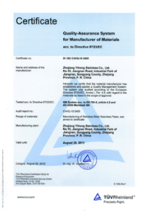 公司嚴格按ISO9001:2015《質(zhì)量管理體系—要求》、ISO14001:2015《環(huán)境管理體系 要求及使用指南》、ISO 45001:2018《職業(yè)健康管理體系 要求及使用指南》和TSG 07—2019《特種設(shè)備生產(chǎn)和充裝單位許可規(guī)則》,建立完善的管理體系。公司擁有國內(nèi)較大的12000KN冷拔機組和先進的全溫控不銹鋼固溶退火爐等生產(chǎn)設(shè)備,同時具有ET16-159渦流探傷儀、UT16-159超聲波探傷儀、UT159-830超聲波探傷儀、H159-630水壓試驗機、WAD—600液壓材料試驗機、4XB電腦金相顯微鏡、JQ—300沖擊試驗機、HBRVU—187.5硬度計、島津光譜儀、化學(xué)分析儀、晶間腐蝕試驗等完善的檢測設(shè)備。